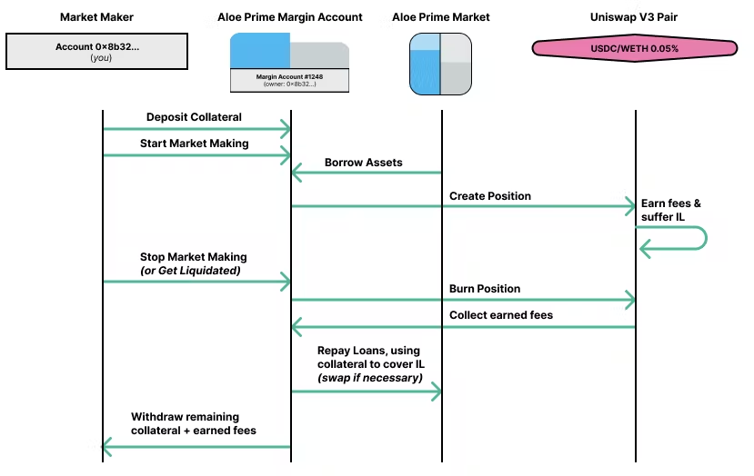 Market makers interact with Aloe Prime through margin accounts, which are special, user-owned contracts that have permission to borrow from the lending markets. These accounts present an interface to their owner, allowing them to control borrow amounts and Uniswap V3 position creation. When positions are closed, earned fees are collected in margin balances, which can ultimately be withdrawn by the market makers.